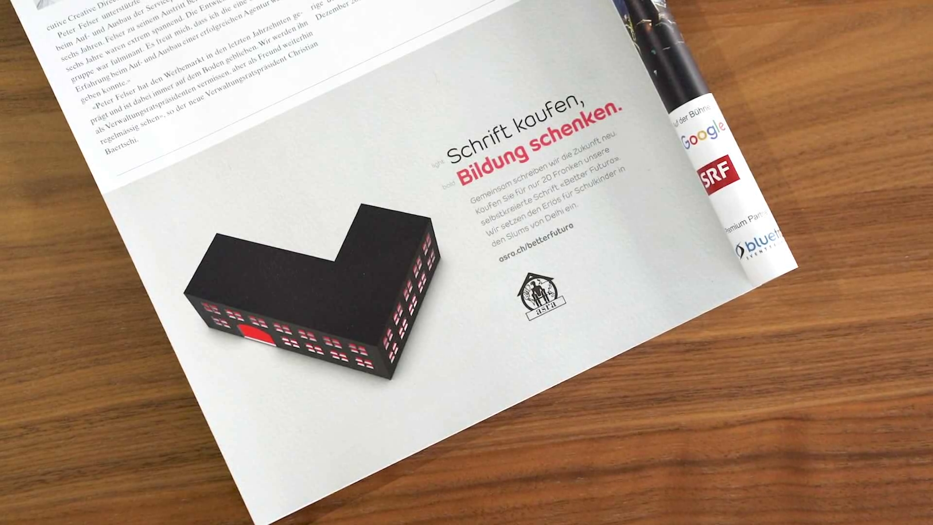 Ein wichtiger Teil der Kampagne ist, dass sie auf eindrückliche und intelligente Art bewusst macht, dass Lesen und Schreiben für viele keine Selbstverständlichkeit sind. So entstand die Idee, eine eigene Schrift zu kreieren und mit dem Mechanismus «Schrift kaufen, Bildung schenken» zu verknüpfen. Der Font ist ästhetisch, aber praktikabel und bietet so einen echten Nutzen für die Spenderin oder den Spender. Anstatt nur eine Spende zu tätigen, wurde die Zielgruppe direkt in ihrem Umfeld abgeholt und erhält mit «Better Futura» die Chance, dem Dialog «Bildung für alle» beizutreten und mit dem Verwenden der Schrift ein Statement zu setzen.